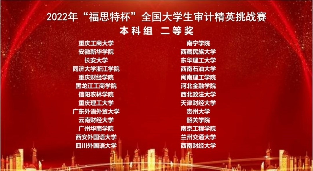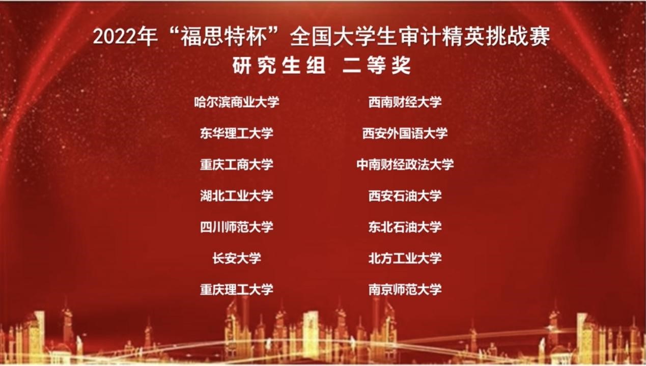 2022年11月26日,由中国审计学会审计教育分会主办、南京审计大学承办的2022年“福思特杯”全国大学生审计精英挑战赛隆重举行。本届审计精英挑战赛采用线上比赛形式,来自全国一百余所高校的390支高职、本科生、研究生队伍参赛。必赢国际437陈祯嫒、秦巧玲、王霖组成的本科代表队和审计专硕研究生廖雨欣、刘佳欣、李祥蓉组成的研究生代表队,从390支队伍中脱颖而出,双双斩获全国二等奖。