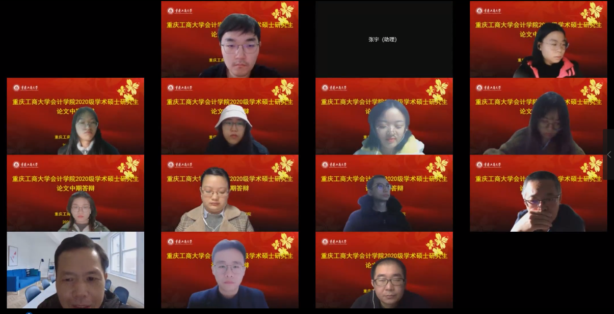 在必赢国际437统筹安排与部署下,研究生教育中心扎实做好线上答辩相关准备工作,保障疫情防控期间线上答辩有条不紊。本次答辩共分为4组,共32名研究生参与答辩。来自湖南大学、西南大学、西南财经大学、北京理工大学等高校的4名会计审计导师担任答辩委员会主席、8名委员与我校部分硕士研究生导师共同组成开题答辩专家组,为同学们的论文进行答辩指导。