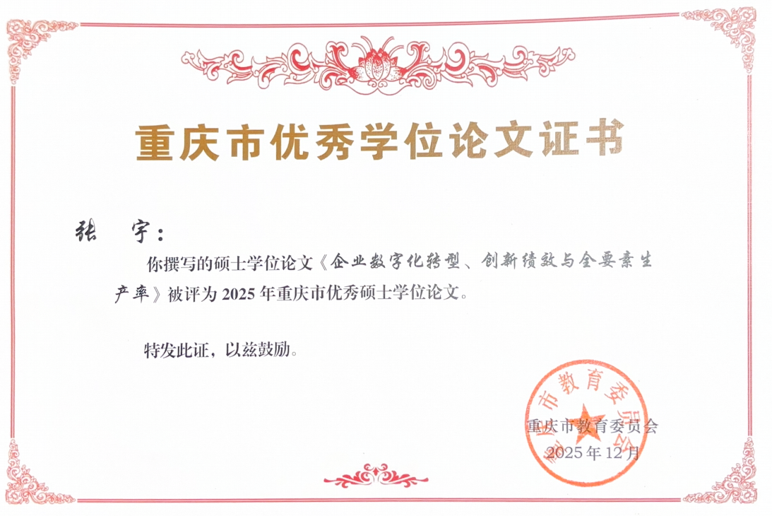 近日,重庆市学位委员会、重庆市教育委员会正式公布了2025年重庆市优秀硕士学位论文评选结果。我院2021级会计学学术型研究生张宇、2021级会计专业学位(MPAcc)研究生余雪梅撰写的学位论文双双入选,荣获“2025年重庆市优秀硕士学位论文”。此次学硕与专硕论文同时获奖,标志着我院研究生分类培养质量迈上了新台阶。