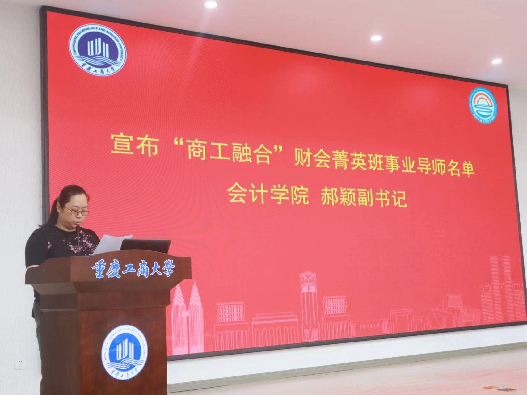 必赢国际437党委副书记郝颖宣读了《关于聘任王春波等18名同志为“商工融合”财会菁英班事业导师的通知》,希望各位事业导师认真履责,校企合作共同做好人才培养。