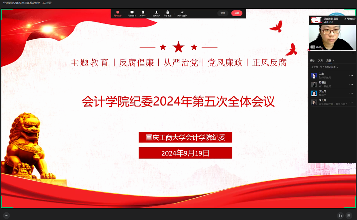 随后,与会人员学习讨论了重庆市6起违规吃喝典型问题。李长艳表示日常工作将筑牢防线,小处着力,坚守红线底线,本分做人做事。兰宗则认为学院清廉风气良好,以后自己将持续以身作则,清廉做事。