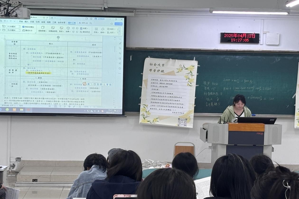为响应学校对学生专业能力培养的号召,结合社团“研习领航促成长,携手并进向未来”精品活动的实践经验,针对初级会计师备考学生在知识点理解、答题技巧、备考规划等方面的痛点,未来会计师协会于2025年4月12日晚上在南岸校区博智楼7121教室,举办初级会计线下研习带学活动,帮助同学们学习与梳理初会相关知识点。