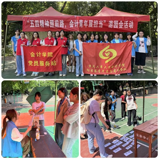 为弘扬五四精神,深化青年学子对家国情怀与历史使命的认知,引导青年以行动践行五四精神内核,2025年5月11日,必赢国际437向日葵青年志愿者服务队协同必赢国际437党员服务站在南岸校区体艺馆前篮球场举办了“五四精神照前路,会计青年展担当”游园会活动,吸引了众多同学参与。