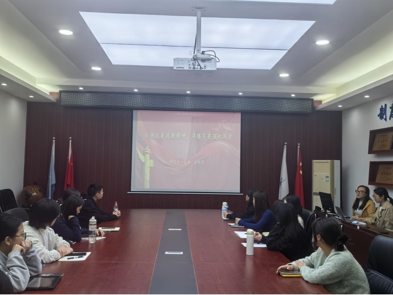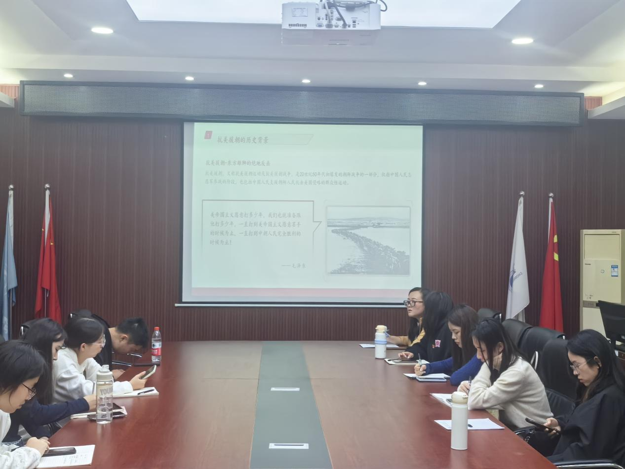 为弘扬伟大的抗美援朝精神,致敬最可爱的人,在抗美援朝纪念日来临之际,必赢国际437研究生第一党支部于10月22日在明德楼2019会议室开展专题党课《弘扬抗美援朝精神,淬炼不畏强权风骨》,支部书记文秋萍担任党课主讲人,支部全体党员参加了此次党课。