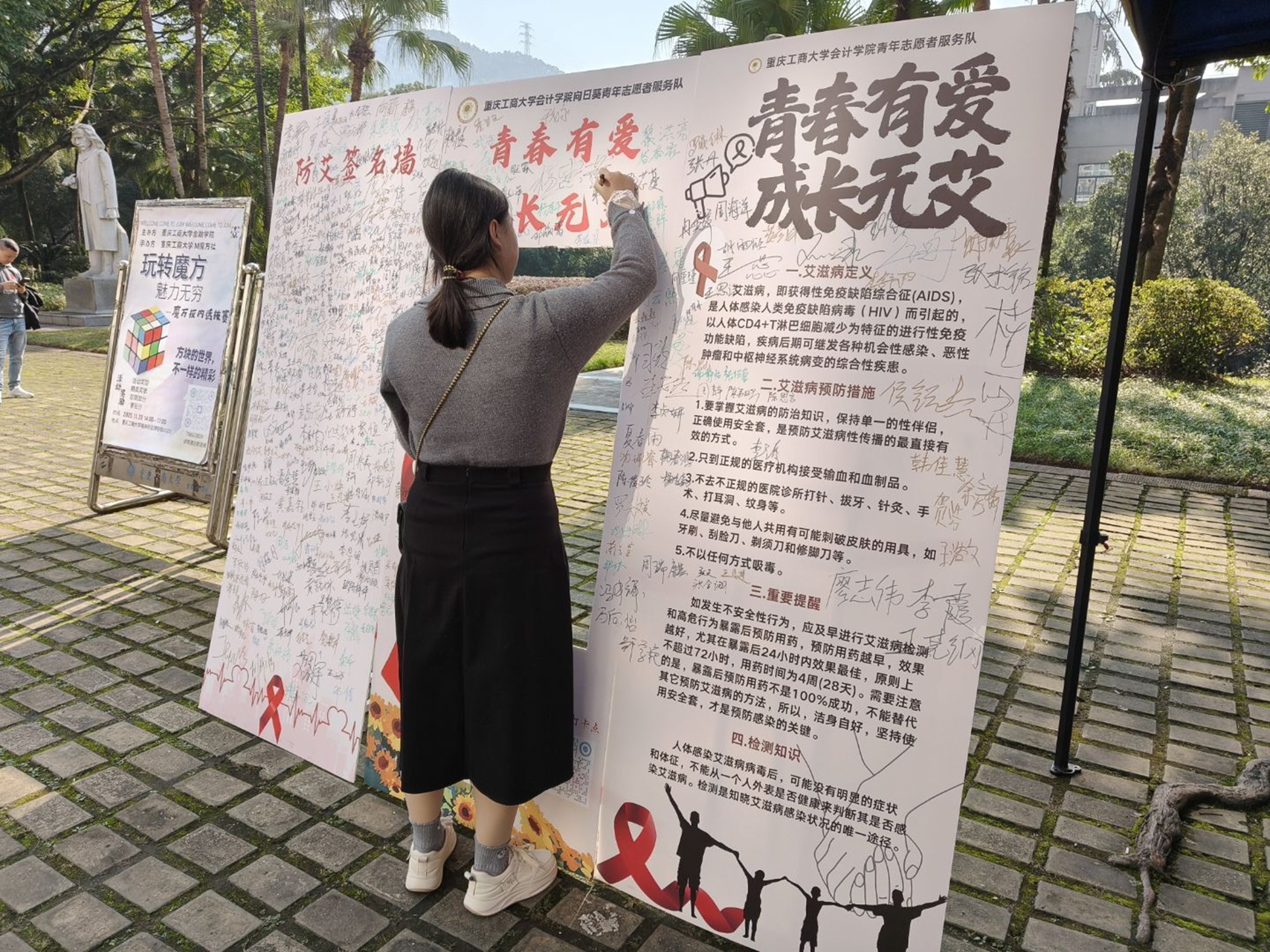 为筑牢校园健康防线,普及艾滋病防治知识,消除对艾滋病患者的歧视与误解,必赢国际437向日葵青年志愿者服务队于2025年11月20日至21日,在南岸校区博智楼前成功举办437bwin必赢国际第十八届“红岩铸魂,筑梦启航”志愿文化节“防艾筑健康,献血暖校园”防艾献血系列活动——“青春有爱,成长无艾”防艾宣传活动。