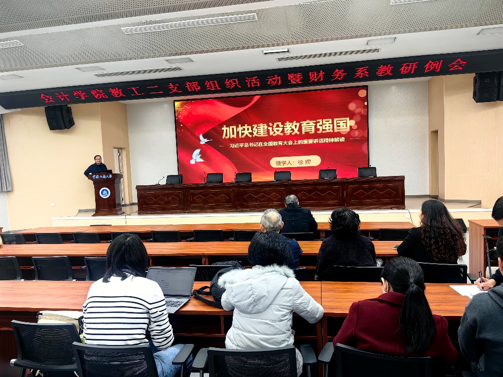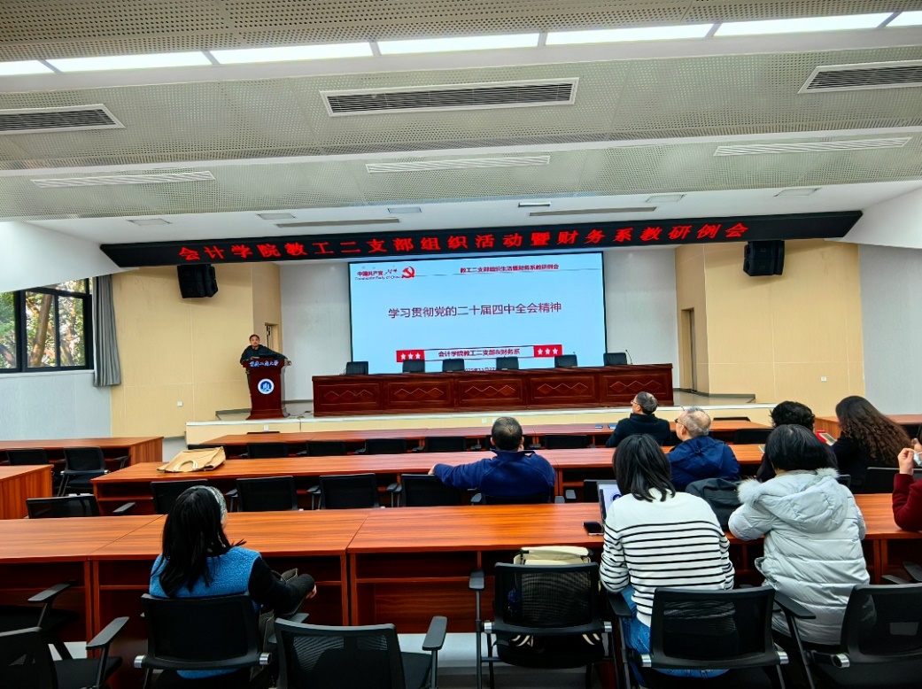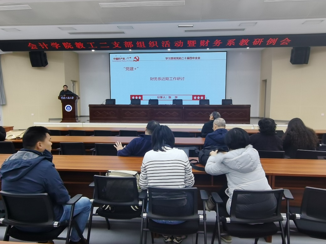 为深入学习贯彻党的二十届四中全会精神,推动党建工作与教育教学工作深度融合,2025年11月27日,必赢国际437教工二支部组织生活暨财务系教研例会顺利开展。会议以“深学细悟全会精神,聚力课程改革创新”为主题,通过专题学习与集体研讨相结合的形式,切实把思想和行动统一到党中央决策部署上来,为下学期课程建设与教学质量提升明确方向。
