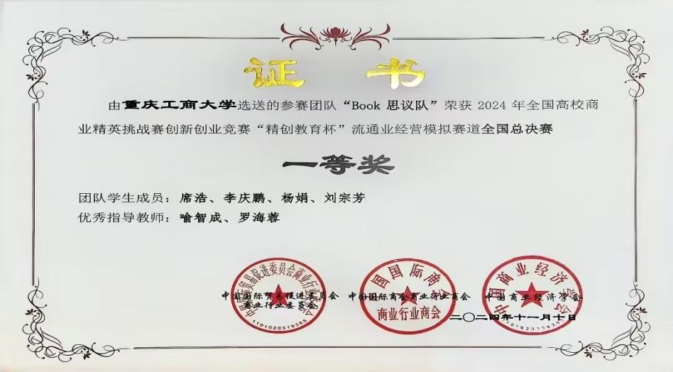 作为团队的主心骨,席浩深谙“聚沙成塔”的智慧:他精准分配任务,让擅长PPT的成员展示细节,让精通Excel的伙伴搭建数据模型,以优势互补凝聚起最强合力。在他的带领下,团队不仅斩获国赛特等奖,更在2024年全国高校商业精英挑战赛中崭露头角——这份凝聚力,是他科创路上最珍贵的“战友勋章”。