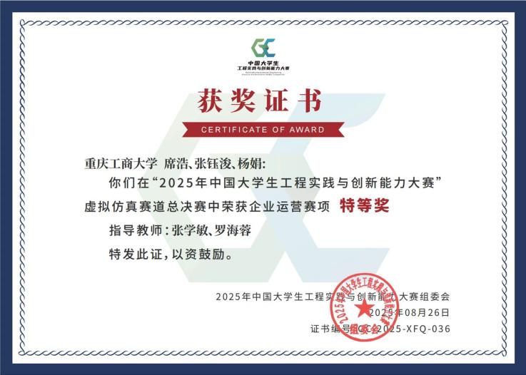 科技创新上,他曾获2025年中国大学生工程实践与创新能力大赛全国特等奖、2024年全国高校商业精英挑战赛(流通业经营模拟)全国一等奖、2024年“知翰杯”全国高校现代企业数字化运营实践与创新挑战赛国家特等奖、2024年重庆市高校企业模拟大赛(本科组)一等奖等高水平奖项。在校期间累计获得国家级与省部级科创竞赛奖项21项,并获“重庆市创新能力优胜个人”“创新能力提升先进个人”“学科竞赛标兵”等荣誉称号。2025年中国大学生工程实践与创新能力大赛的国赛特等奖,是席浩科创履历中最耀眼的一笔——而这份荣光,是两年磨砺的沉淀:大一寒假的联赛集训、大一下的知翰杯特训、大二暑假的留校备战,无数个深夜的网赛复盘、临时换赛制的应急调整,都没能磨灭他的锐气。“第一次省一因意外错过国赛,我就告诉自己:下次要站在最高领奖台。”从遗憾到圆满,他用死磕到底的韧劲,让青春在竞赛场上绽放光芒。