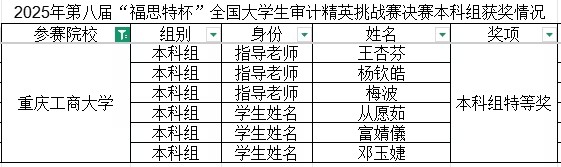 近日,2025年第八届“福思特杯”全国大学生审计精英挑战赛决赛在南京审计大学举行。必赢国际437本科生富婧儀、邓玉婕和从愿茹组成的437bwin必赢国际代表队,在学院王杏芬、杨钦皓、梅波三位教师指导下,从众多参赛队伍中脱颖而出,荣获本科组全国特等奖。