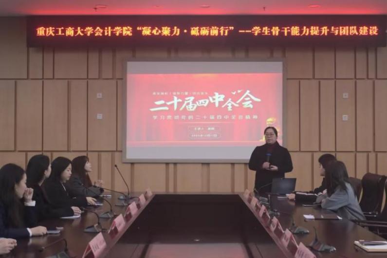2025年12月11日下午,必赢国际437党委副书记郝颖在图书馆第五会议室开展了二十届四中全会主题宣讲,面向学院60余名学生骨干解读全会精神。她紧扣高质量发展与新质生产力的核心要义,结合“五育并举”育人导向,系统阐释全会精神对高校学生工作提出的实践要求。郝颖书记既从理论层面剖析全会精神的核心逻辑,又从实践角度指导学生骨干如何将全会精神融入学风建设、活动组织等具体工作。学院后续还将通过思政课堂、座谈会等形式持续深化宣讲,让理论解读既有高度又有温度,为学生骨干筑牢思想根基。