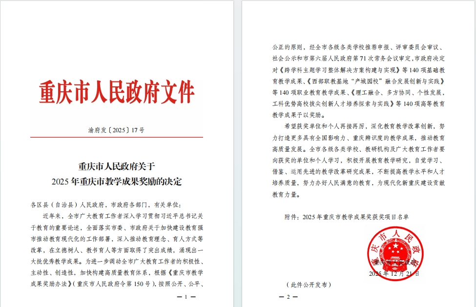 重庆市教学成果奖由重庆市人民政府设立,每四年评选一次,是重庆市教育领域级别最高、影响力最广、认可度最强的政府性奖项。