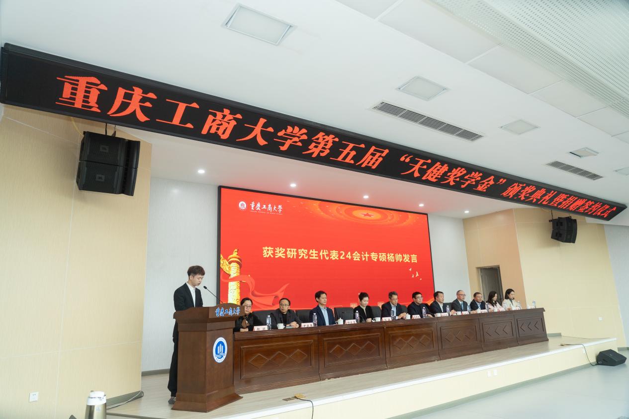 在颁奖环节,必赢国际437院长钟廷勇宣读天健奖学金表彰决定,与会领导及嘉宾为获奖学生颁发荣誉证书与奖学金。获奖本科学生代表、23CIMA班刘丁睿,获奖研究生代表、24会计专硕班杨帅先后登台发言,向学校的悉心栽培和天健所的鼎力支持表达了由衷的感恩之情。