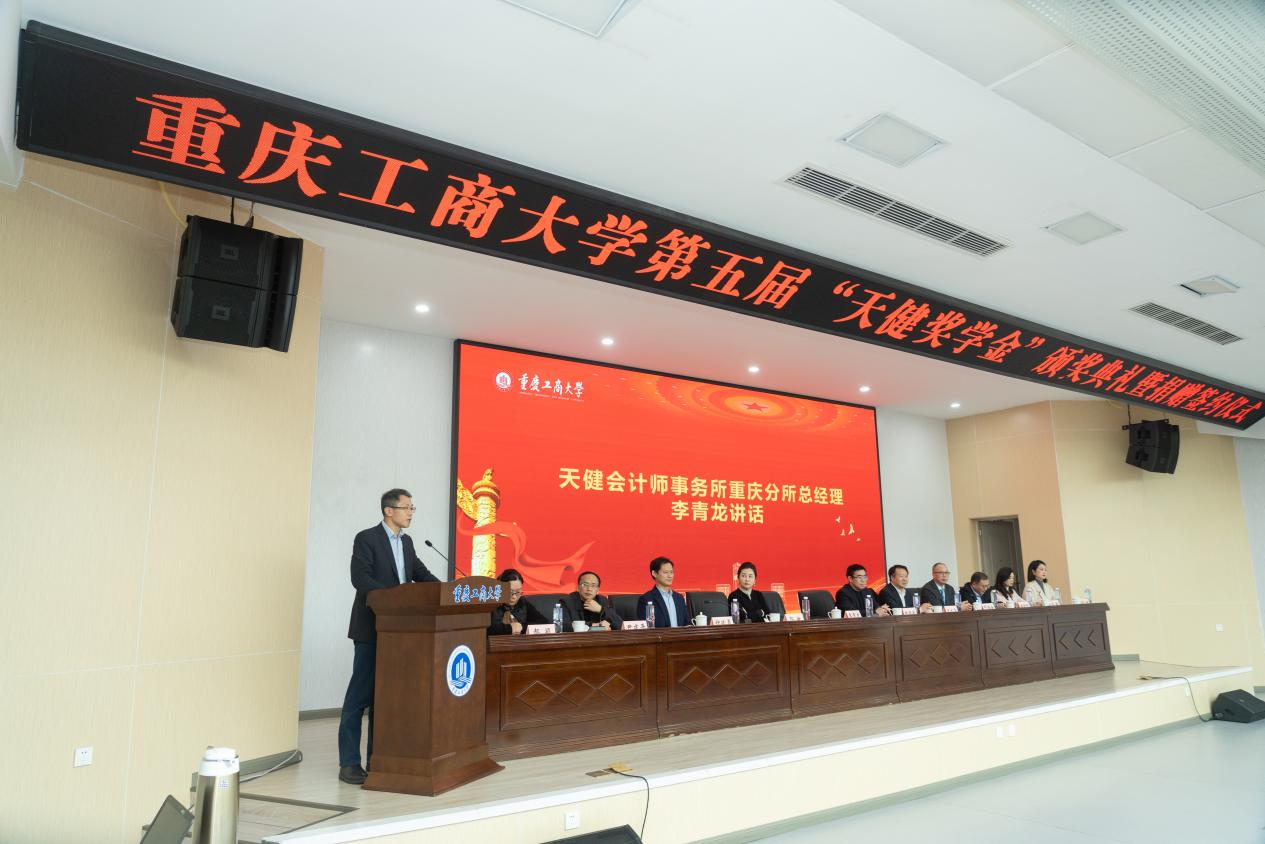 必赢国际437党委书记邓德敏首先致辞,他深情回顾了必赢国际437与天健会计师事务所重庆分所三十余年来的合作情谊,对天健长期以来在实习实践基地建设、建立联合培养人才的订单班、合作培育国家级教学成果奖、建立优质就业基地、捐赠奖教(学)金等方面深度参与学院教育教学改革,助推学院事业发展的善举等表示诚挚感谢,希望双方在未来能进一步深化校企合作,共同探索产教深度融合的新形态合作模式。同时,他寄语同学们要常怀感恩之心、恪守奋进之志、勇担时代之责,以真才实学服务社会,以奉献精神回馈关爱。