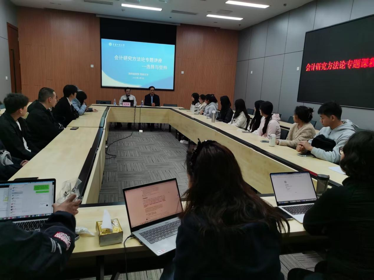 本期沙龙特别邀请西南大学刘向强教授莅临指导,围绕会计研究方法这一主题为同学们进行深入讲解。讲座历时两个小时,内容翔实、见解深刻。讲座结束后,刘教授与在场研究生展开面对面交流,就如何精准选题、如何系统推进研究等同学们普遍关注的问题进行了耐心解答与悉心指导,有效帮助同学们厘清选题思路,化解科研困惑,为今后的学术研究之路少走弯路、稳步前行奠定了良好基础。