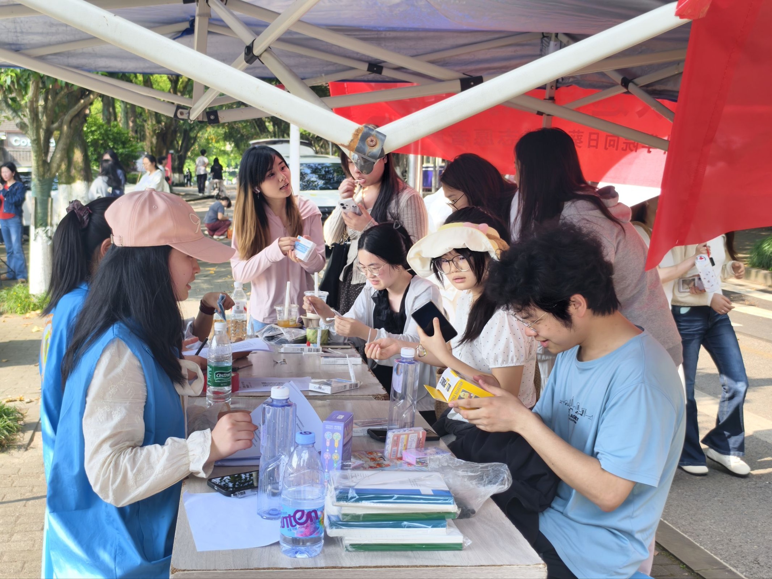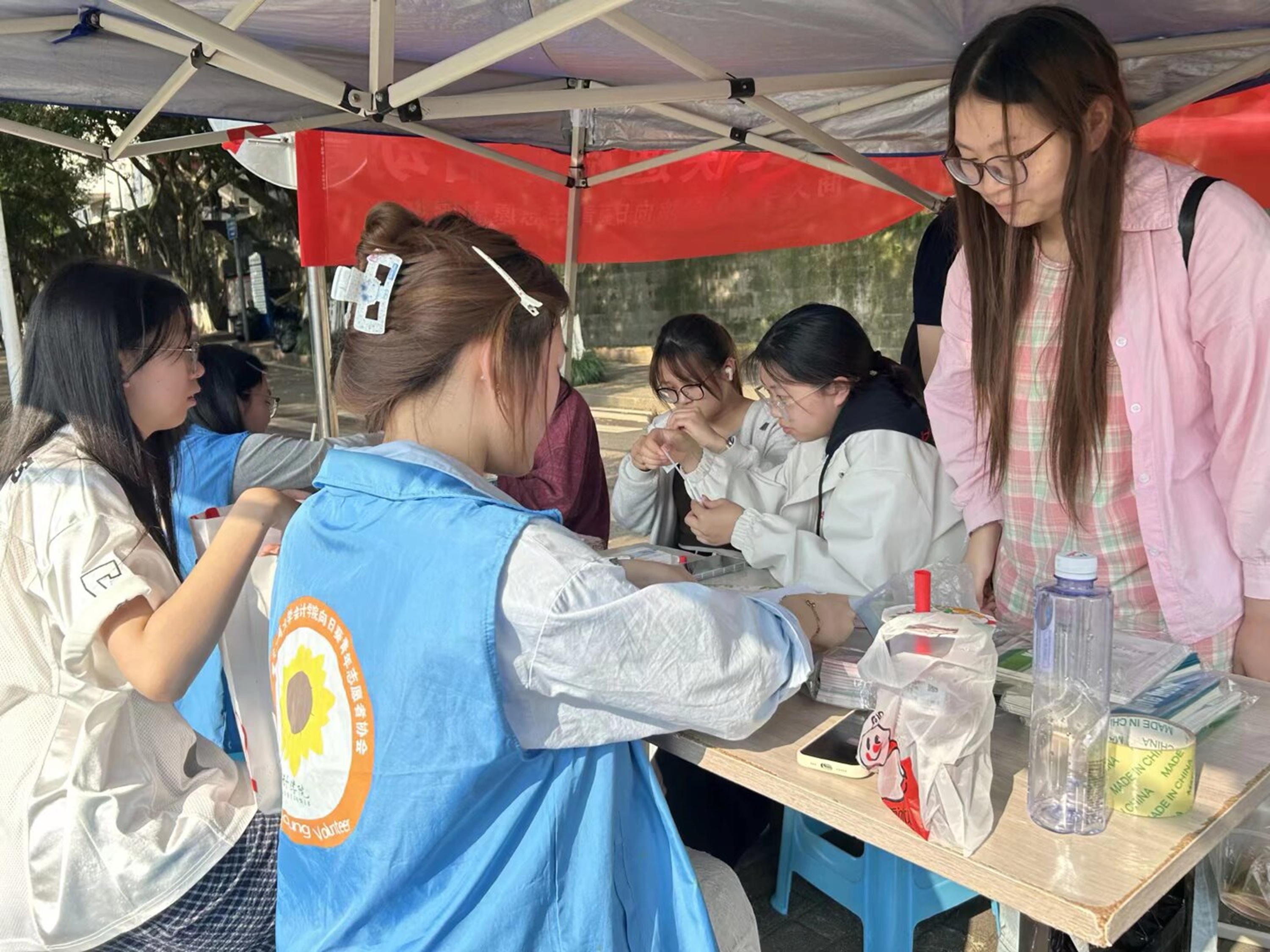 活动当天,香樟林活动点布置有序、氛围温馨,志愿者们准时到岗,用饱满的热情迎接来往同学。活动现场设置科普宣传、试剂检测、知识问答等多个区域,志愿者们主动向同学们发放防艾宣传资料,细致讲解艾滋病的传播、预防、检测方法等知识,耐心解答同学们关于检测流程、隐私保护、结果解读等疑问,帮助大家破除认知误区,消除对检测的恐惧心理。