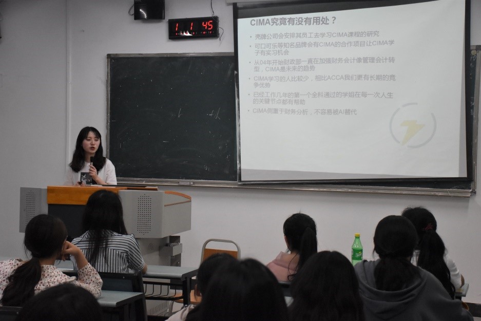 随后,分享会到了交流分享学习经验的环节中,学姐根据自己参加各种竞赛的经验,为同学们的四年学习初步做出了一个规划建议。最后,考虑到18级CIMA班的同学们本学期就要参加全球统考,项雪莹同学从CIMA考试流程和学习方法方面为同学们解答了疑惑,希望学弟学妹们能够从自己的建议与不足中吸取经验,拓展视野。