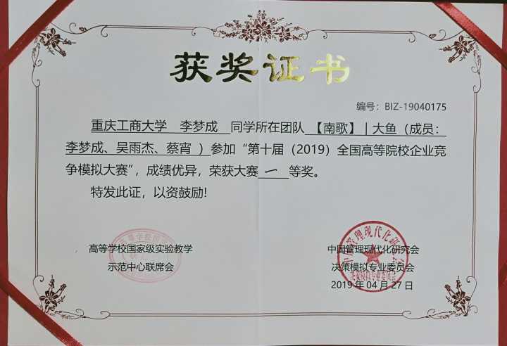 在4月26日-28日的2019全国高等院校企业竞争模拟大赛中,由我院16级会计三班李梦成同学、数统学院吴雨杰同学、财金学院蔡宵同学组成的“【南歌】|大鱼”队荣获 全国决赛一等奖,收获了不俗的成绩!