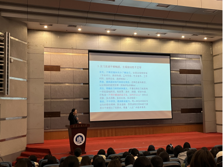 袁利华老师就专业实习的具体要求向大家作了讲解,包括实习手册的撰写、与实习指导老师的沟通以及在实习单位的行为规范等,希望同学们认真遵守实习单位的管理规定,与实习指导老师加强联系,扎实完成实习期间的各项任务,并将实习所学运用于毕业论文写作中。