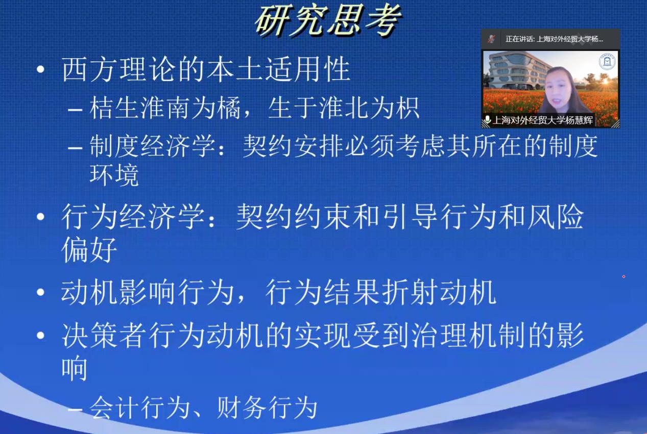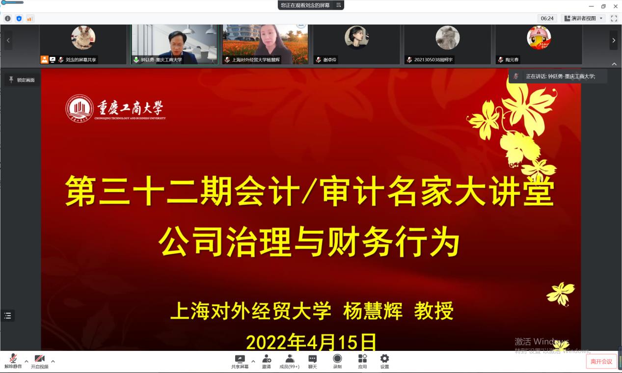 4月15日,必赢国际437第三十二期会计/审计名家大讲堂以在线会议的形式顺利举行。上海对外经贸大学必赢国际437副院长杨慧辉教授应邀为必赢国际437师生作了《公司治理与财务行为》的专题培训讲座。讲座由必赢国际437副院长钟廷勇教授主持。