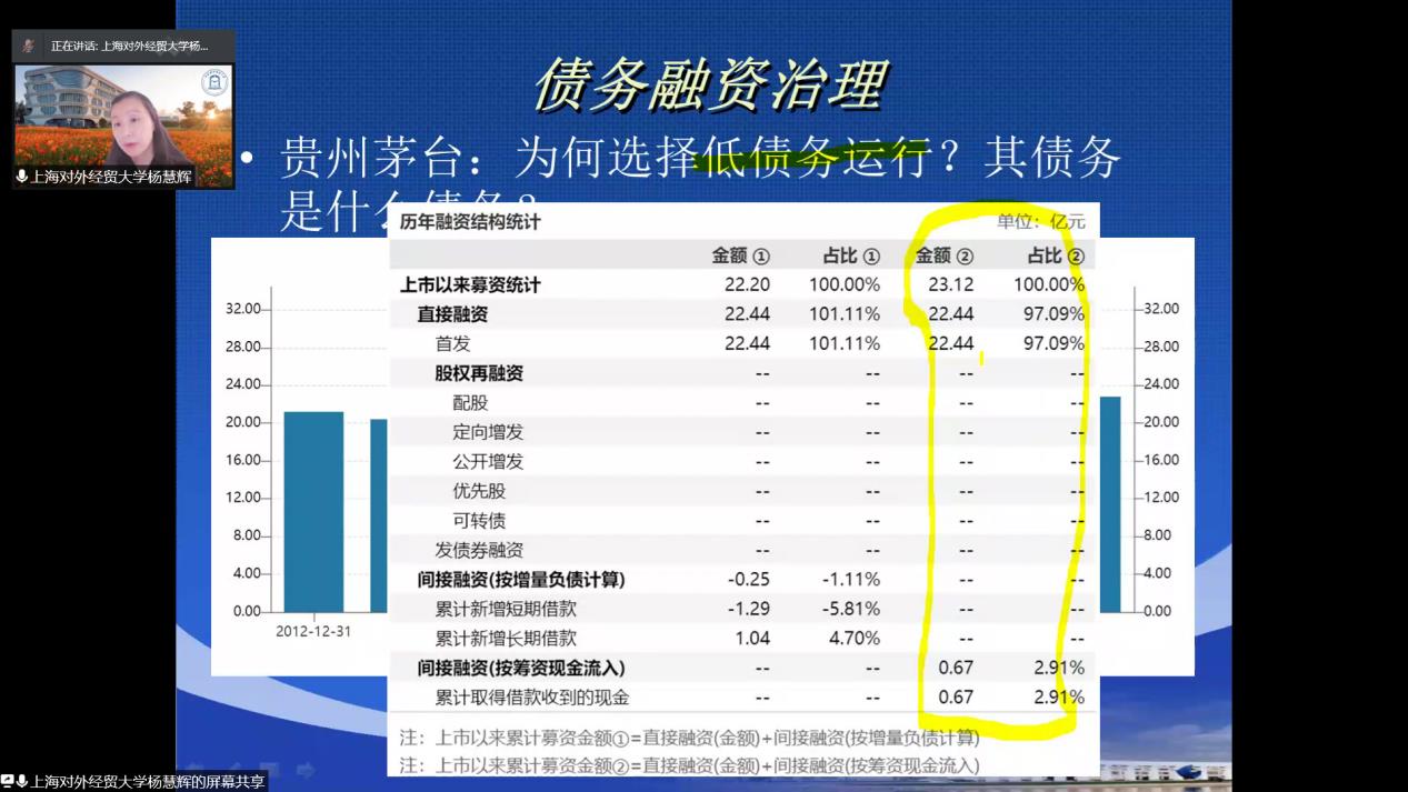 杨教授以贵州茅台为例,对经营债务和金融债务展开阐述。在总结部分,杨教授从股权分散结构与股权集中结构下的公司治理与公司财务行为两方面进行分析,分别说明了股东与管理层的代理冲突及财务行为扭曲的问题。杨教授重点强调,我们要从底层逻辑框架上对西方理论进行本土适用性的调整,基于中国环境进行理论分析、假设推导,才能真正把学问做在中国大地上。