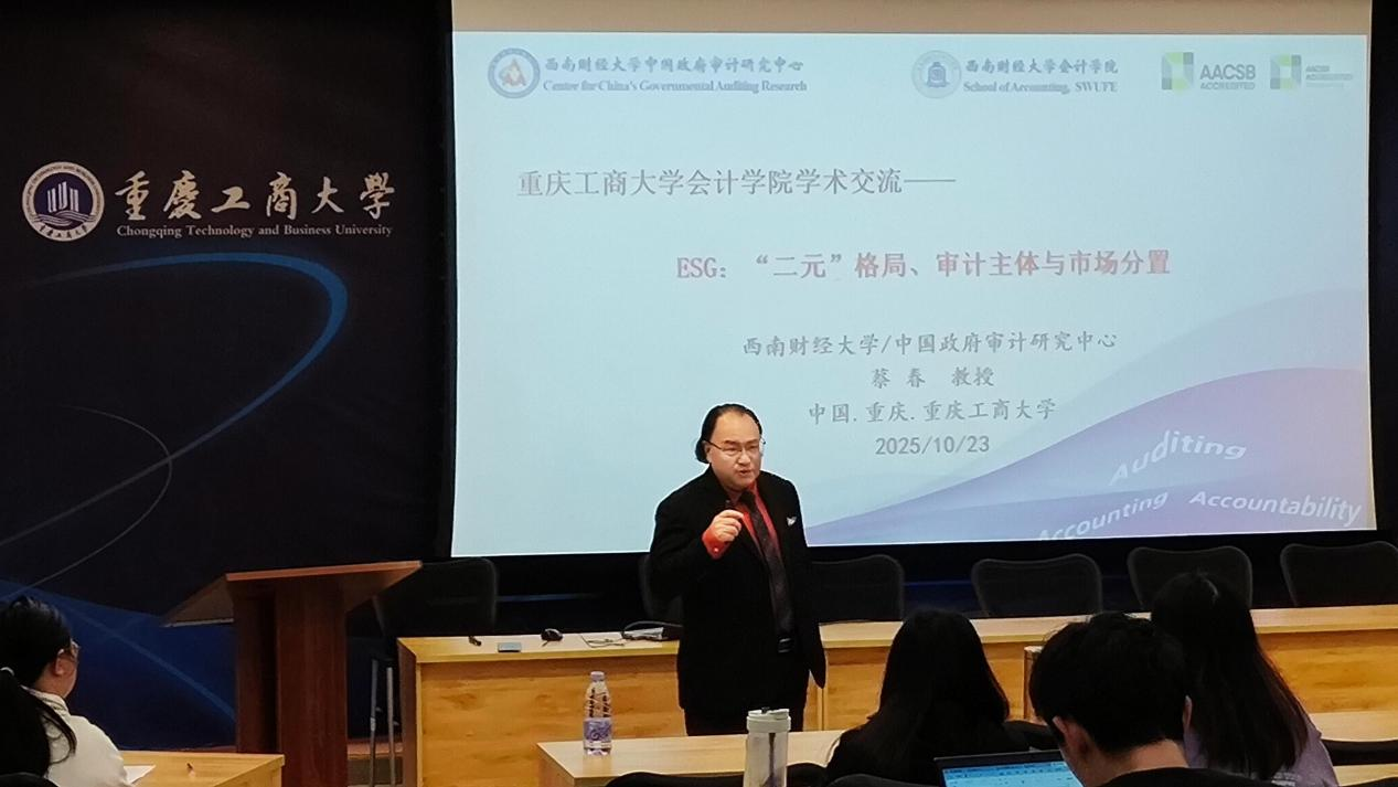 2025年10月23日,必赢国际437在博智楼7108成功举办第六十六期会计/审计名家大讲堂。本次大讲堂主题为“ESG:‘二元’格局、审计主体与市场分置”,由西南财经大学中国政府审计研究中心蔡春教授主讲,必赢国际437院长钟廷勇担任主持。