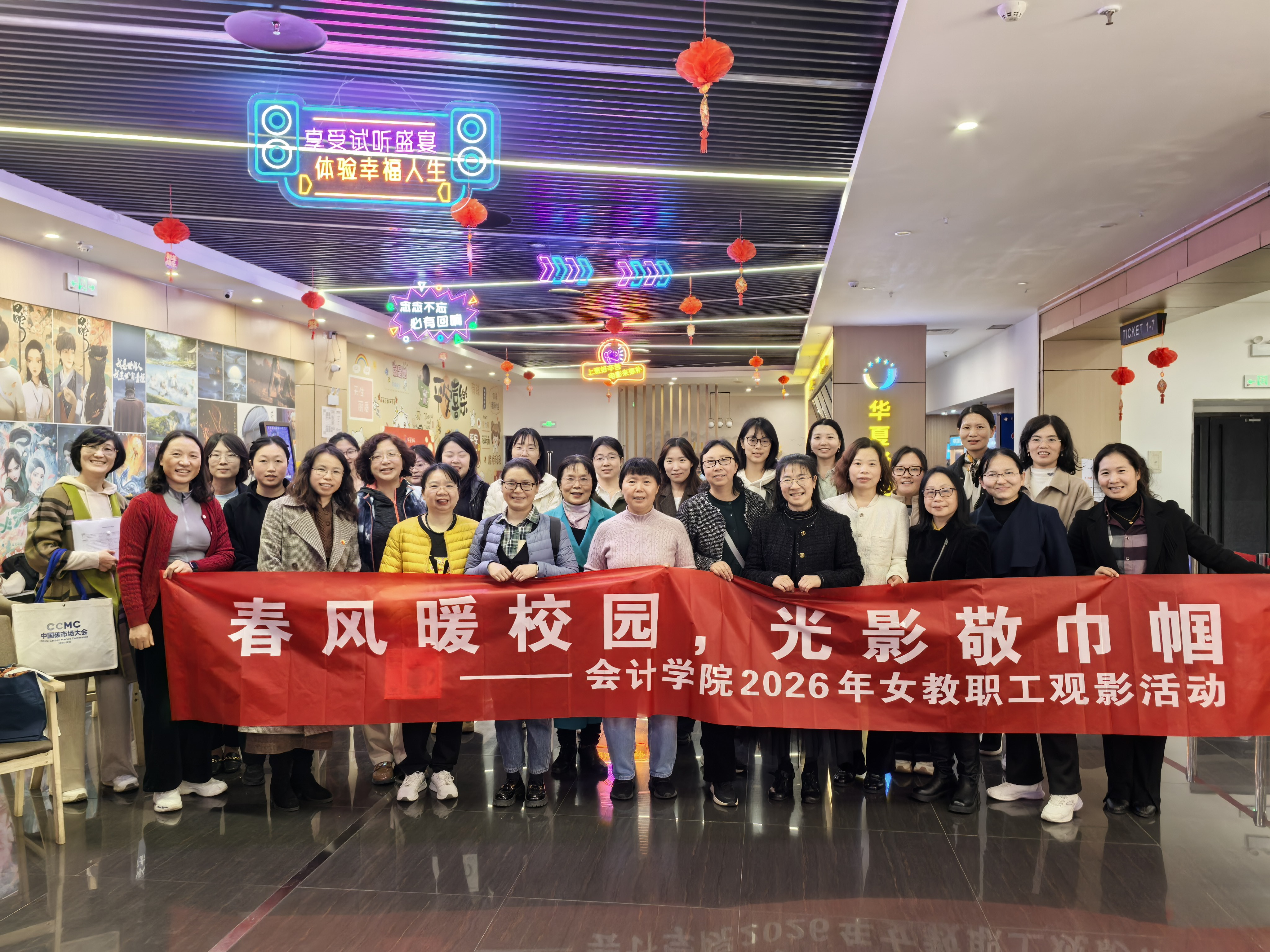 2026年3月5日,必赢国际437“春风暖校园,光影敬巾帼”——2026年女教职工观影活动在华夏影院顺利举行,学院全体女教职工及部分男教职工代表一同参加活动。