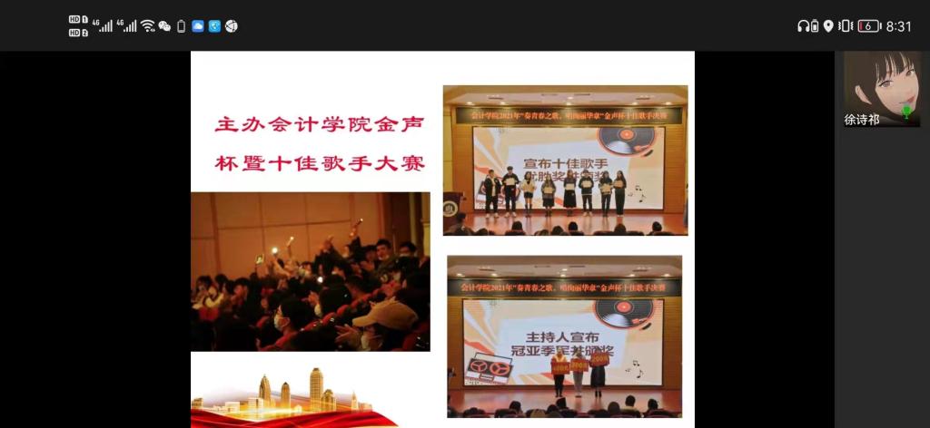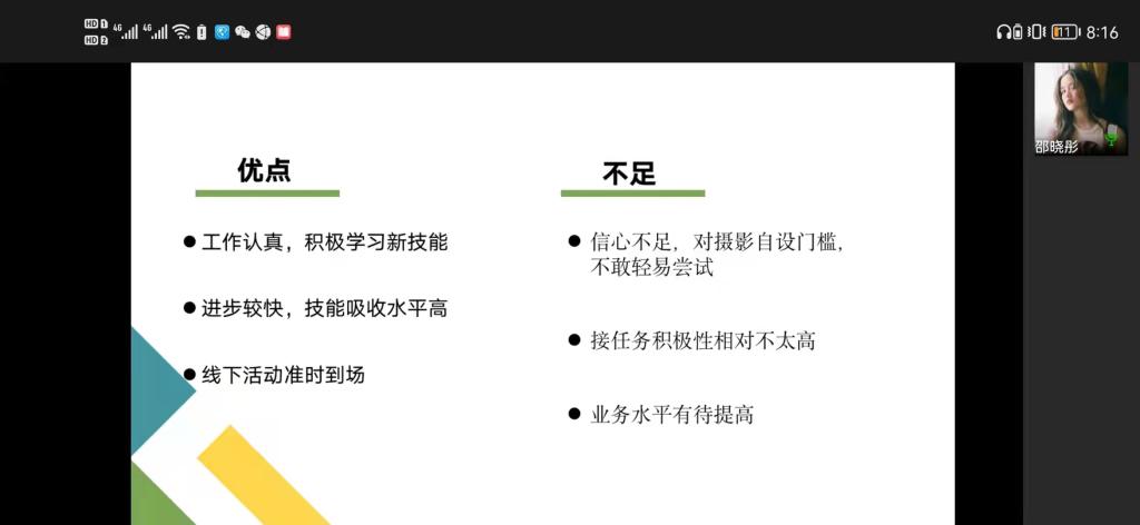 接着,分团委社会实践部黄晓楠从国庆线上打卡活动、学生组织骨干素质大会、提案大赛、其他活动、部门总结等五个方面进行工作汇报。她表示,社会实践部本学期表现良好,完成本部门的任务的同时也尽可能协助其他部门开展工作。希望在下一学期社会实践部能够更上一层楼,继续进步。