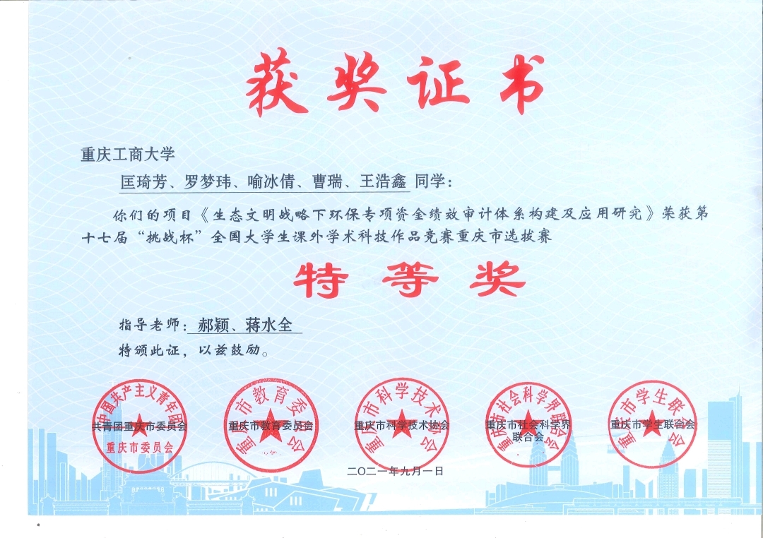 3月29日,第十七届“挑战杯”全国大学生课外学术科技作品竞赛授奖名单公布,必赢国际437本科生匡琦芳、罗梦玮、喻冰倩、曹瑞、王浩鑫(指导老师:郝颖 蒋水全)组成的团队(参赛题目:生态文明战略下环保专项资金绩效审计体系构建及应用研究)荣获全国三等奖(重庆赛区特等奖),这是我校必赢国际437在该项赛事的重大突破。