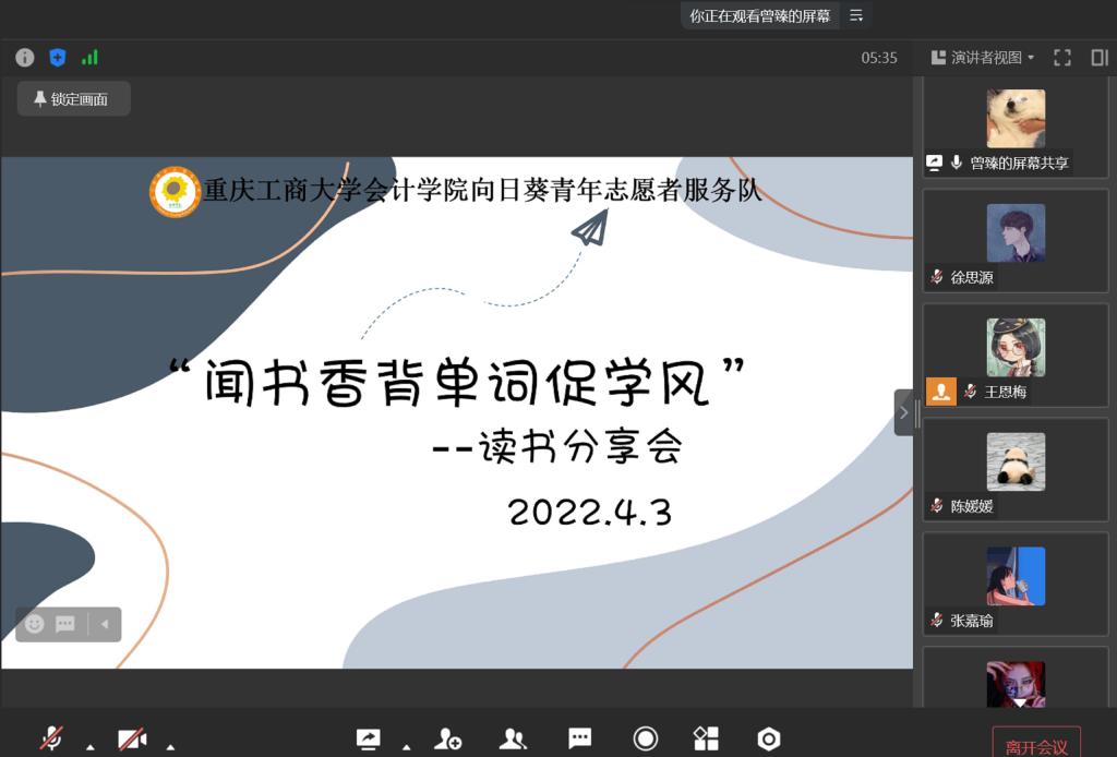 听闻书香气,最能抚人心。第二个子活动线上读书分享会于4月3日下午举行,参与者或是分享所读书目中喜爱的语句、情景、角色或文化,又或是分享读后感受或推荐书物等。第三个子活动读书打卡活动共计417人参加,同学们将自己读书的心得和感想分享在QQ空间,在4月4日到4月6日连续打卡三天。以书会友,共沐书香,将自己的好书分享出来,让更多的人与你同享好书的魅力;将自己的读书感想分享出来,在思维与灵魂的碰撞中让好书越读越新。