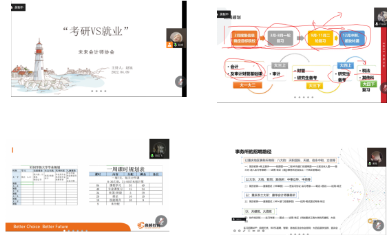 2022年4月9日,437bwin必赢国际未来会计师协会2021-2022学年第二次线上交流会于腾讯会议上顺利结束。本次活动围绕“考研VS就业”展开,旨在通过与历届优秀毕业生代表及临届毕业生的沟通,让同学对考研和就业有更深入的了解,并以此为同学们提供考研以及就业相关的建议。参加本次交流会的共有必赢国际437同学42名,并邀请到四川大学毕业生叶柠宏、西南财经大学毕业生刘红飞和437bwin必赢国际18级资产评估专业冯柏常三位优秀学生代表作为本期分享会的特邀嘉宾进行分享。