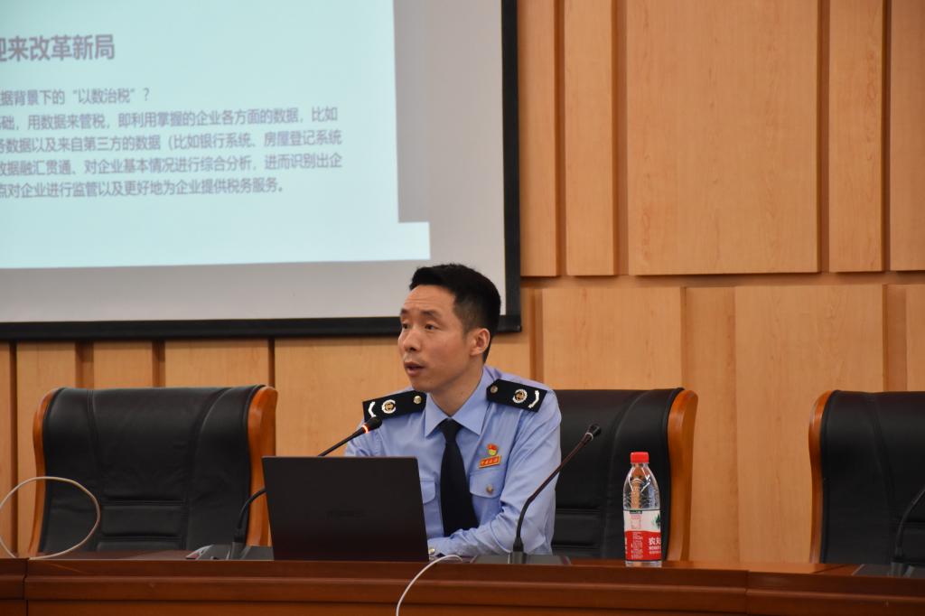 最后,由重庆市南岸区税务局李鹍老师从大数据背景下的税收风险管理工作进行相关介绍。“以数治税”迎来改革新局,结合相关政策环境、实现环境和机构设置,在大数据背景下进行以数治税成为大势所趋。同时李鹍老师对“以数治税”在风险管理中应用及发展方向进行相关介绍,“以数治税”主要应用于发票协查、个人冒用、“纳税人画像”、跨部门协作等方面,在未来的大数据时代背景下,提高纳税服务水平,更好地为企业提供纳税服务。最后李鹍老师向我们普及了相关行政处罚和刑事处罚,并号召广大学子为国聚财、为民纳税;尊崇税法、依法纳税。