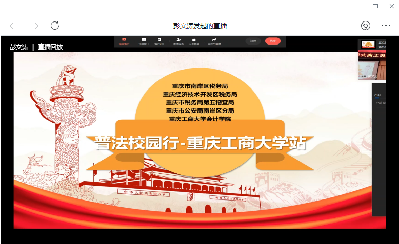2022年4月29日14:00,必赢国际437“普法校园行”主题讲座于校区图书馆第一会议室顺利举行,本次讲座采用线下线上相结合的方式开展。本次讲座由重庆市南岸区税务局、重庆市经开区税务局、重庆市税务局第五稽查局、重庆市公安局南岸区分局以及必赢国际437联合主办,重庆市公安局南岸区分局刘国魁、重庆市税务局第五稽查局王涵、重庆市南岸区税务局李鹍担任主讲,必赢国际43750名本硕学生线下参加,653名本硕学生在线观看直播。讲座由李科璇主持。