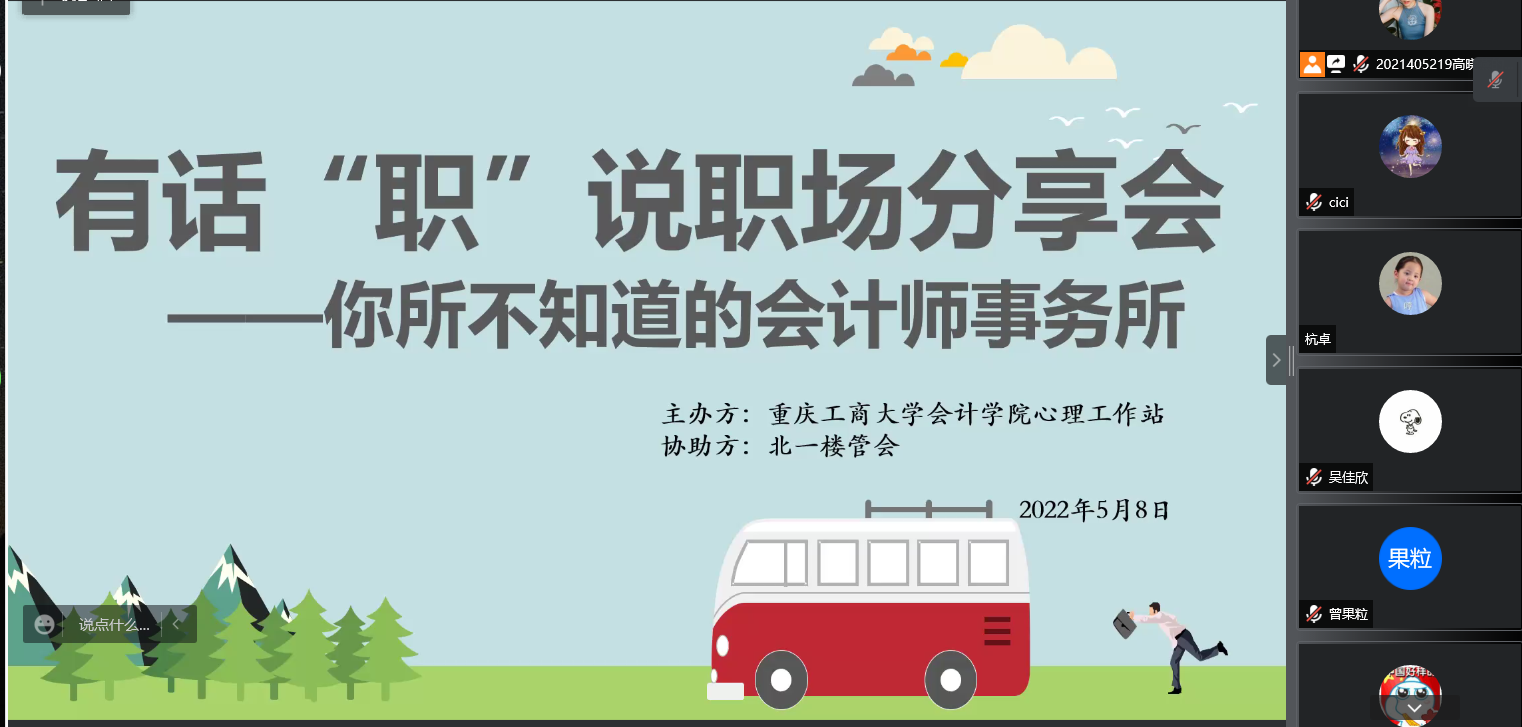 为帮助同学们有效解决专业学习、职业生涯成长中的困惑,让同学们提前了解职场环境和能力需求,更好地为求职做准备,2022年5月8日19:00必赢国际437心理工作站线上展开了有话“职”说职场分享会。本次活动邀请到我院优秀毕业生,现任北京字节跳动科技有限公司财务bp,曾担任德勤华永审计经理——郭海龙为同学分享他的职场经验。本次活动共吸引了近300位同学积极参与。