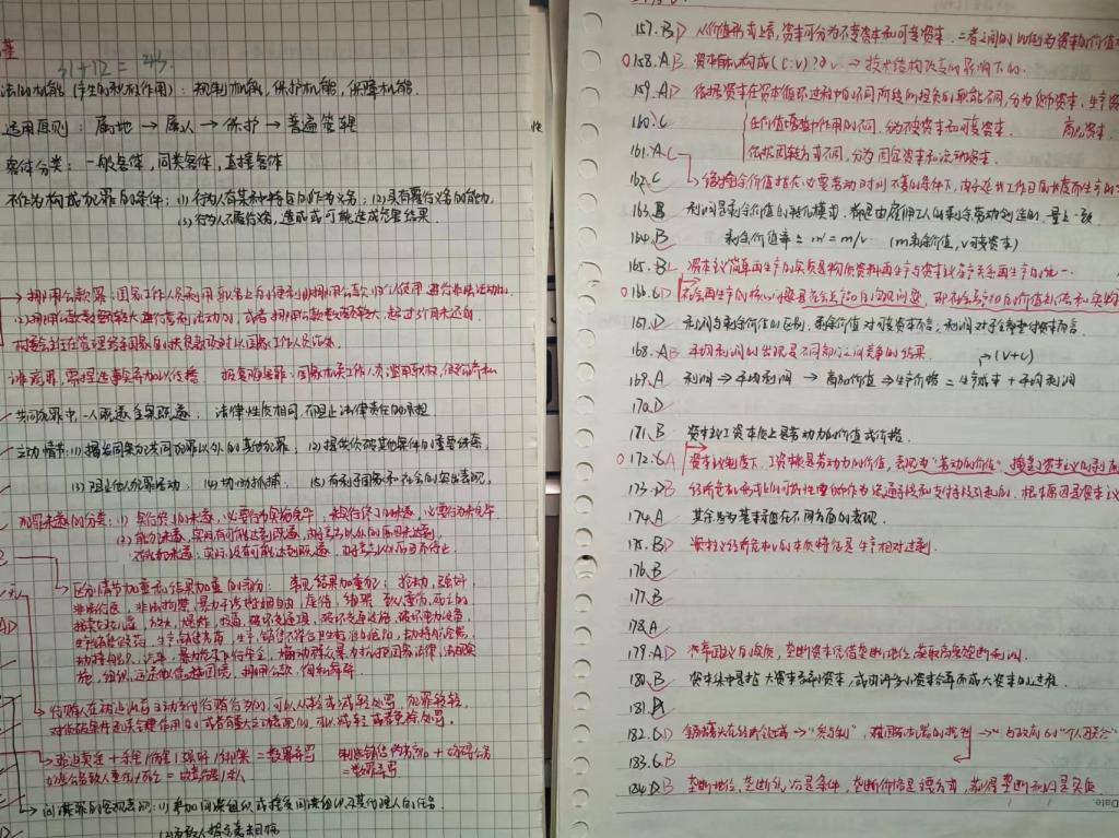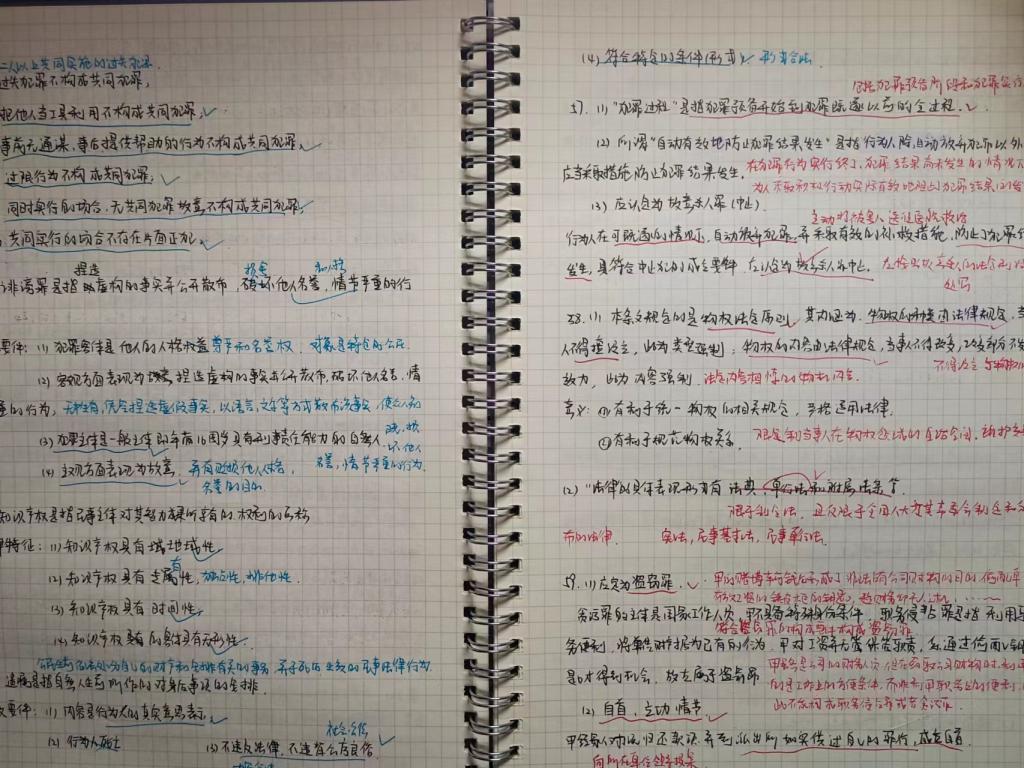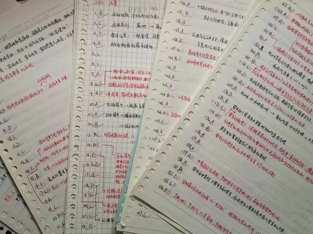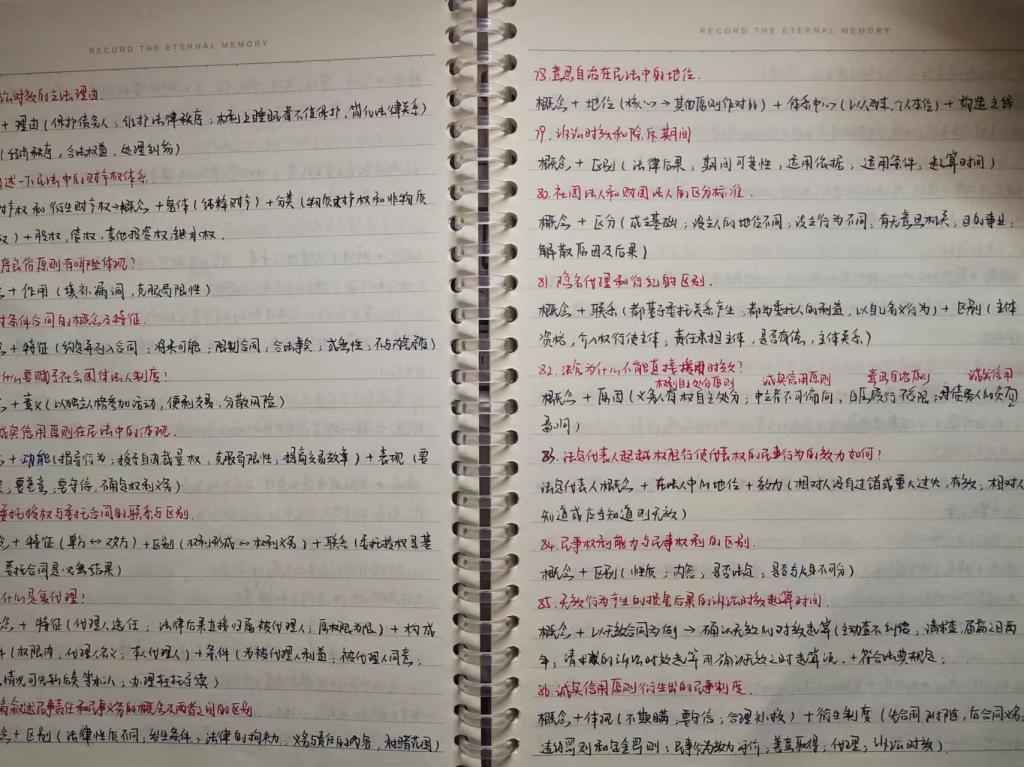 (3)知识点练习:刑法:总则分则皆重点,今年考察偏向案例实际分析,一定要理解、乐于思考规则背后的原理,梳理框架便于掌握整体;民法:分编学习,整理重要概念,梳理框架建立学习体系,重点难点反复看;法理学:理清逻辑,辅以各大老师编的口诀记忆,也可以自己编;宪法学:多看法条,重难点多花时间,可以借助图表理顺各大关系;法制史:培养学习兴趣、借助历史故事和朝代脉络来记忆。