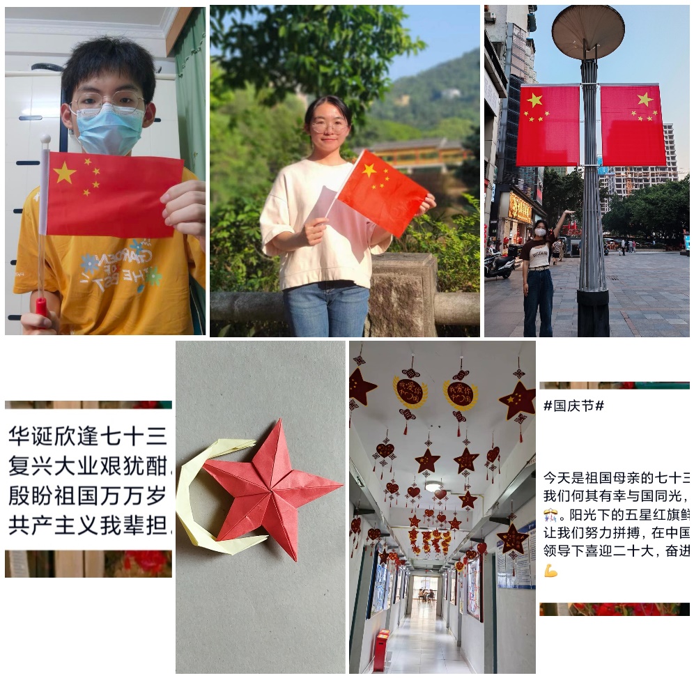 国庆假日,校园内外,处处喜气祥和。必赢国际437学生纷纷与国旗合影。有的自行准备了小国旗,与国旗一起打卡校园的美丽角落;有的行走于闹市,与国旗一同感受这繁华盛世;也有同学在家中与国旗合影,乡村或城市,天南或地北,都表达了对祖国的深切眷念。部分心灵手巧的同学,制作了精美的手工品,表达对祖国母亲的诚挚祝福。必赢国际437党员服务站刘元春同学说:“回望祖国七十三年历史征程,曲折磅礴,觉得非常感动。”20智能会计班方懋凤同学说“国家犹如长辈,教会我们要不畏艰难、努力奋斗,真的有幸生在这样的中国。”21财会八班的庞锐烽同学则深情赋诗一首,“华诞欣逢七十三,复兴大业艰尤酣。殷盼祖国万万岁,共产主义我辈担!”