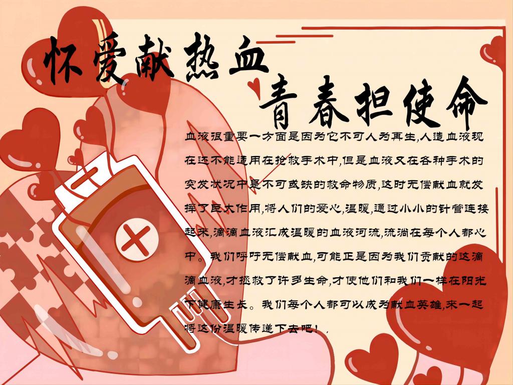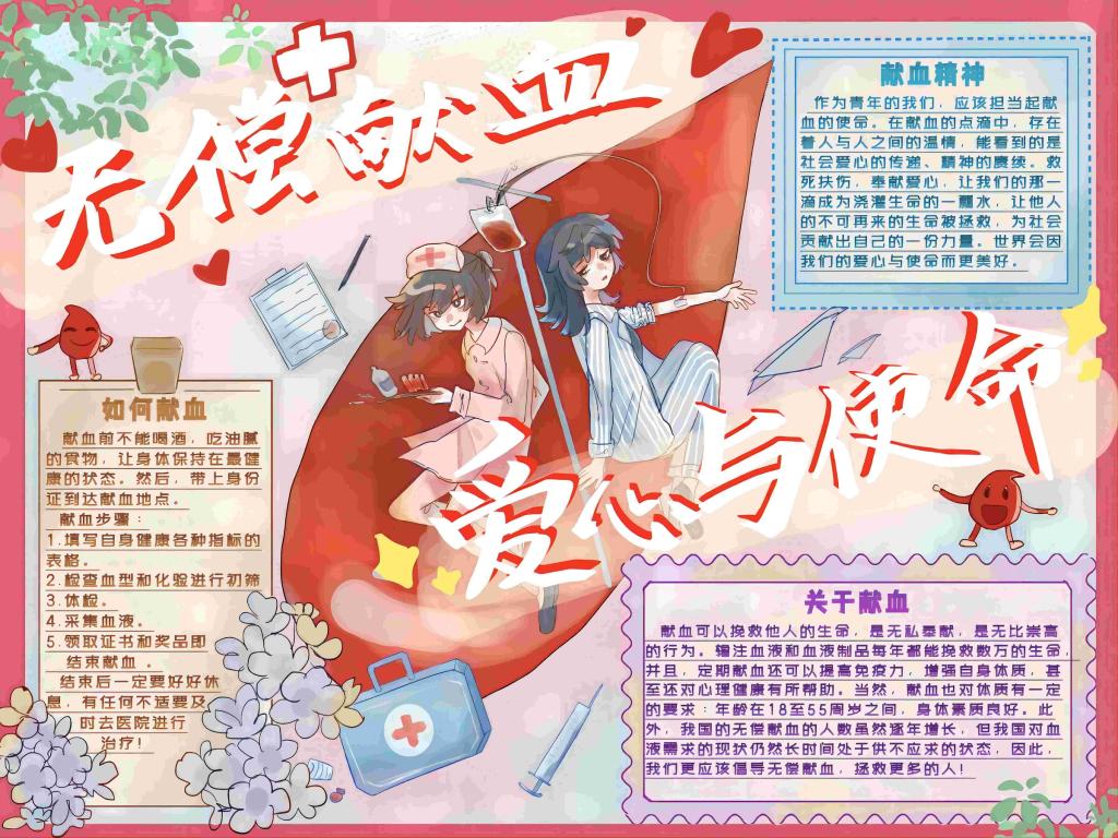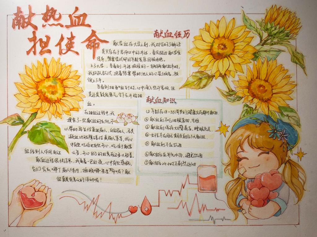 为贯彻落实习近平总书记在党的二十大报告中勉励广大青年要立志做有理想、敢担当、能吃苦、肯奋斗的新时代好青年,增强大学生的社会责任感、号召人民群众积极了解、参与献血活动, 2022年11月14日-11月23日,必赢国际437向日葵青年志愿者服务队主办的“怀爱献热血,青春担使命”手抄报大赛于线上顺利开展。本次活动面向437bwin必赢国际全体学生,旨在提高同学们的动手能力,消除学生对献血的误区,推动社会献血事业的发展。