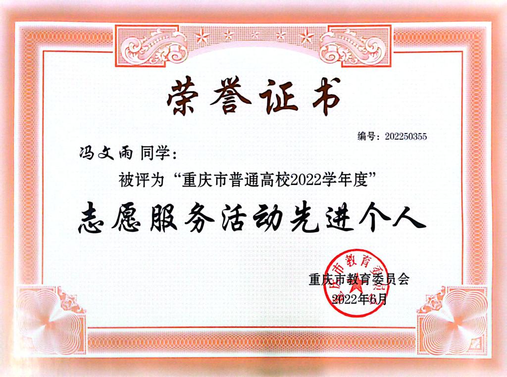 大学四年,冯文雨参加了大大小小公益服务活动50余次,在企事业单位实习过4次。她提到,在校内外参与公益活动的时候是她感觉最有价值的时刻。她说,三年的“三下乡”社会实践,极大地培养了个人能力。2020年的“声讯传情,抚慰心灵”线上支教让她对山里孩子对知识的渴望有了更深的体会;2021年,作为“益路同行,童心向党”的负责人她也以志愿者的身份给武隆山区学生传递知识与力量;2022年,为促进巴南区黄金林村的发展,她与团队深入调研,为黄金林村乡村振兴之路发言献策。在事务所实习的一个月里,她因为出色的沟通能力,被安排走访了14家公司。在这过程中,她需要与不同的券商、律师、企业家进行沟通,这对她开阔视野,提升独立能力有深远影响。