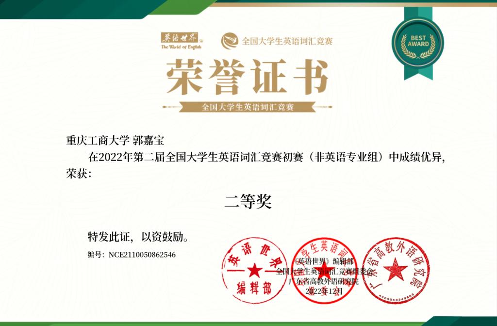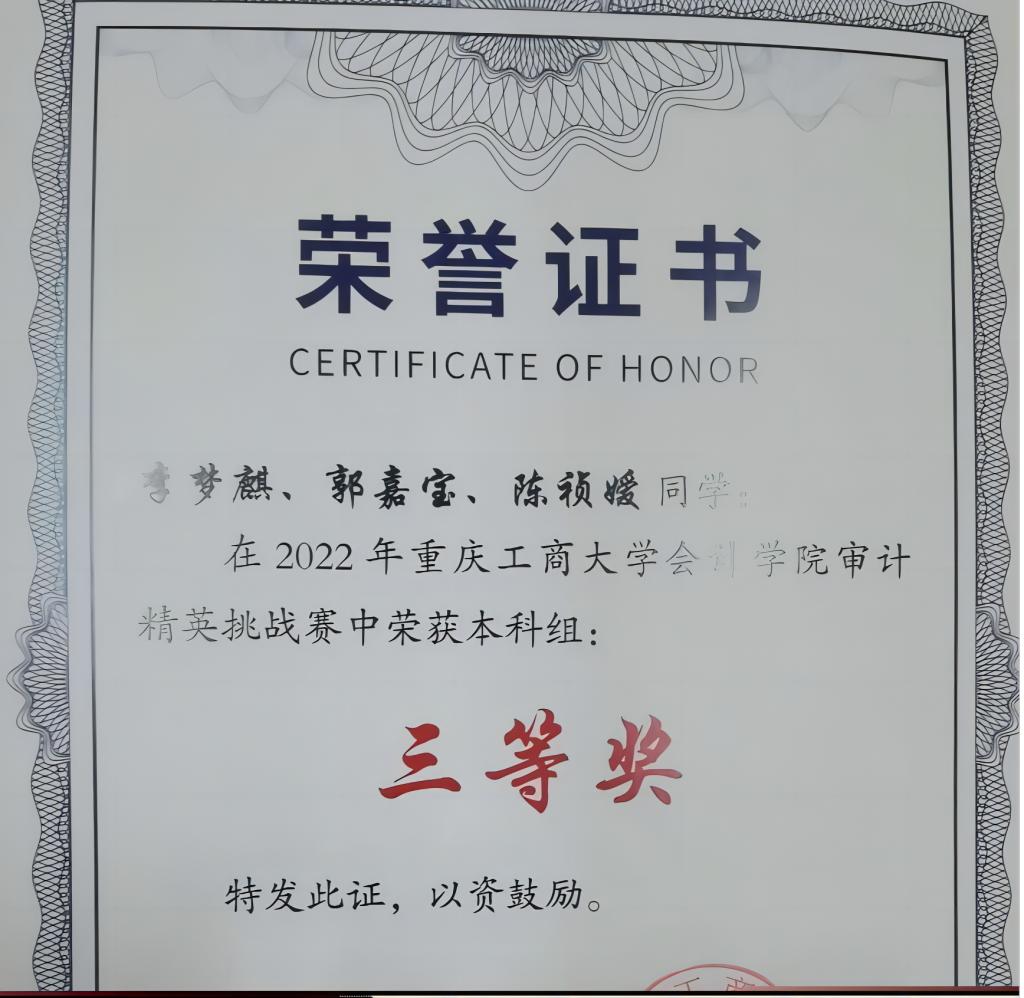 郭嘉宝 2020级审计二班,大学平均绩点4.02,中共预备党员,曾荣获国家奖学金、国家励志奖学金、综合一等奖学金、学习优秀奖学金、迪马薪火奖学金等,荣获2022年会计之星—自强之星称号。曾获得大学生“互联网+”校赛二等奖、大学生乡村振兴校赛二等奖、审计精英挑战赛校赛三等奖等。
