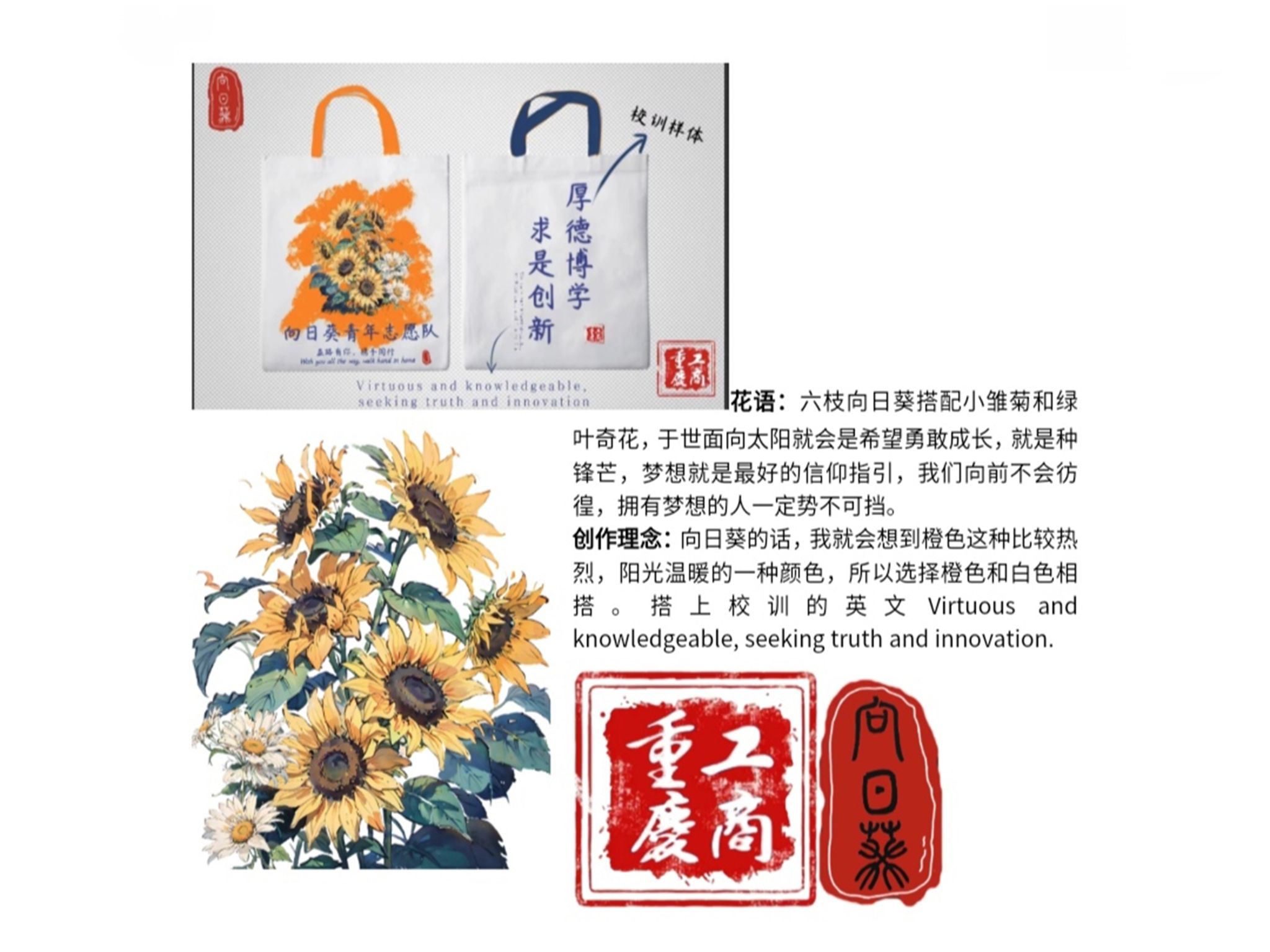 评审团根据评分细则综合遴选出一等奖13名,二等奖26名,三等奖39名。选手们的参赛作品整体上呈现出青年队“向阳而生”的青春活力。其中,一等奖获得者周晨同学的作品展示了六枝向日葵向阳而生,并将437bwin必赢国际“厚德博学,求是创新”的校训融入作品中,她还在作品中提到:我们梦想的力量势不可当,只有怀揣着希望向梦想奔跑时,以梦想为指引,才不会在未来的人生旅途中感到彷徨。志愿队伍正在不断地壮大,也有越来越多向日葵般的志愿者心怀梦想,在社会中以温暖无私的大爱传递着无限的希望。