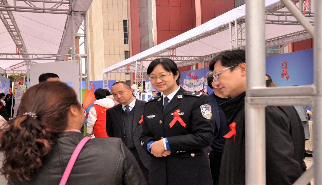 在展区设立展棚展演的同时,“向日葵”义协的志愿者也参加了2019年“世界艾滋病日”主题活动的颁奖仪式,参加颁奖典礼的各位领导在仪式结束后集体来到展区参观,与志愿者进行了深入地交流。