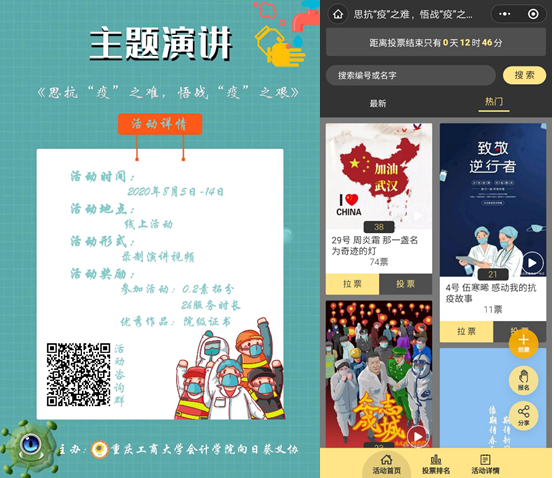 本次活动历时10天,共收到了42份来自必赢国际437同学们的演讲作品。此次活动本着公平公开公正的原则,采用公投:内投=3:7的形式进行评选,最终选出了七份优秀作品。在本次活动开展的过程中,同学们意兴高昂、善于巧思,推动着活动朝着多元化方向迈进。有的作品内容与自身专业紧密相连,考虑到了此次疫情对本专业未来发展的影响,有的作品则是从自身角度出发,做生活上的“有心人”,看到了身边的战“疫”事迹。镜头面前,同学们表现得落落大方,演讲内容贴合主题,并融入了当今时代对青年们的使命期望,情感真挚而富有感染力。这也充分达到了此次活动举办的目的,在传递真情的同时,锻炼了同学们的语言表达能力,丰富了大学生们的课余文化知识,增强了其时代使命感。