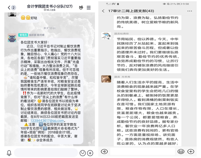 线上团日活动中,同学们认真学习了习总书记对制止餐饮浪费行为作出重要指示,围绕“拒绝舌尖上的浪费”的主题展开了积极的讨论。2017级丁俊程:以“光盘”为荣,以“剩饭”为耻,坚持“餐餐不余、年年有余”,争做爱粮节粮的践行者;2017级杜燕玲:节用裕民、俭以养德。我们要继续弘扬艰苦奋斗、勤俭节约的优良传统,自觉养成勤俭节约的习惯。2018级林婉滨:这一切时刻在提醒我们杜绝浪费,从过做起。一、餐餐光盘,二、科学点餐,三、拒绝铺张,四、健康饮食,五、记得打包,六、坚守“粮”心;“民以食为天,一粥一饭当思来之不易”、“浪费粮食问题不能小觑,拒绝餐桌浪费,浪费可耻,支持光盘行动”。每一段文字都体现会计学子作为新一代青年居安思危的意识,自觉做到反对餐饮浪费,践行勤俭节约的良好习惯。