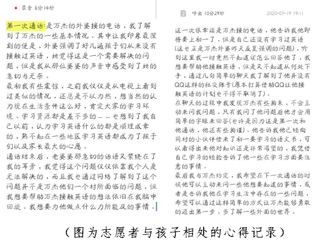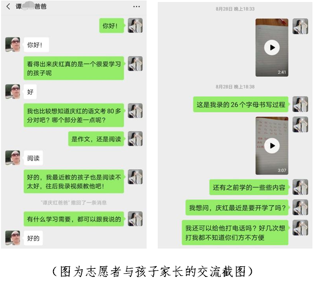 7月15日,志愿者和孩子们的一对一分配工作完成;7月19日,活动的第一次通讯结束,正式建立起联系,志愿者们也对孩子们的家庭及教育情况进行了初步了解。“第一次通话有了许多以前从未有过的感触”这是第一个完成通话的志愿者的感慨。活动持续了一个半月,期间志愿者为教孩子学习英语,自制字母书写视频;为使内向孩子敞开心扉,从影视娱乐方面引导;为了孩子顺利开学,贴心准备开学必备清单。缘分总是妙不可言,他们习惯了彼此的存在,活动的意义也不再是活动本身。通过有趣方式让孩子们较快接受相应知识的同时,慢慢拓展其视野,给孩子们带去知识和关爱,助孩子们培养热爱学习、热爱生活的良好观念;陪伴他们克服困难、解决问题,锻炼过硬的本领,磨炼坚韧的品质。志愿者们的建议总能帮助孩子们少走弯路,他们个人的经历也往往能勾起孩子们的无限期待,从而对自己的未来有更加明确的目标。