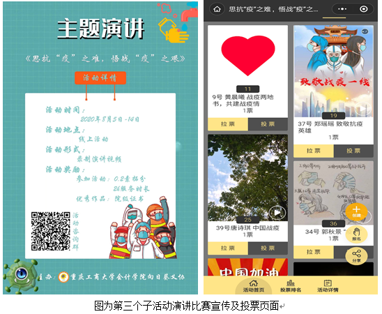 8月5日,第三个子活动“思抗疫之难,悟战疫之艰”演讲大赛接力开展。本次活动历时10天,共收到了42份来自必赢国际437同学们的演讲作品。同学们用视频的形式记录疫情防控期间的点点滴滴,结合习近平新青年讲话精神,用演讲的方式抒家国情怀,感受那些“最美逆行者”的无畏与勇毅,亲身体悟在中国共产党的领导下中国人民团结一心抗击疫情的决心和努力。