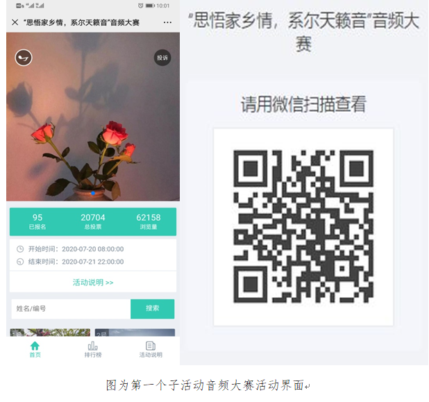 7月15日,第一个子活动“思悟家乡情,系尔天籁音” 音频大赛如期开展,共历时七天,同学们实践热情的高涨,共收到95份来自必赢国际437同学的作品,在投票的过程中,投票界面的浏览量达到62149次,总票数达20704。本次活动采用线上征集电台录音的形式来情系家乡,模式新颖、有趣,能够激发参与者和收听者的兴趣,部分作品更是从专业角度看待家乡变迁,为各自家乡发最美之声,并且在此次活动脱颖而出的众多优秀作品中,我们听出了他们对自己家乡的“知之甚深”和“爱之愈切”。