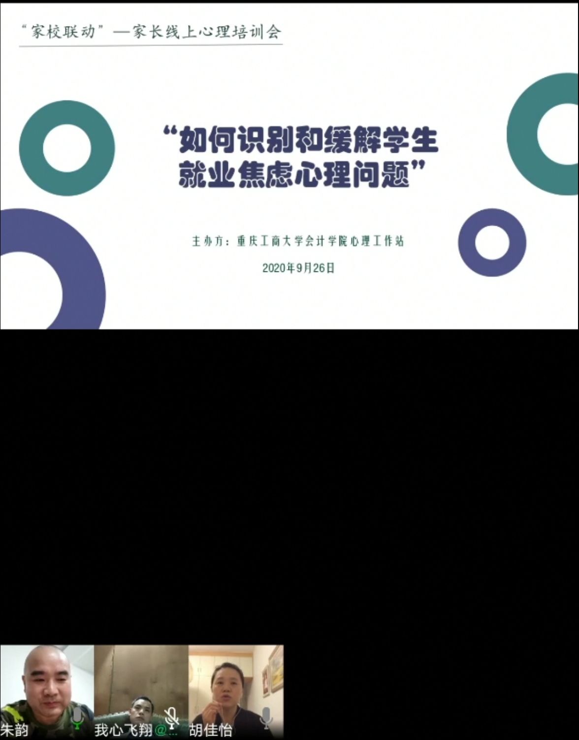 新冠肺炎疫情的爆发对应届毕业生的就业产生了极大冲击,大学生面临较大的就业压力。为了指导我院应届毕业生有效识别和缓解就业带来的焦虑,协助家长助力孩子应对焦虑情绪,必赢国际437心理工作站于2020年9月26日19:00,开展了“家校联动家长线上心理培训会——如何识别和缓解学生就业焦虑心理问题”的线上专题培训会。