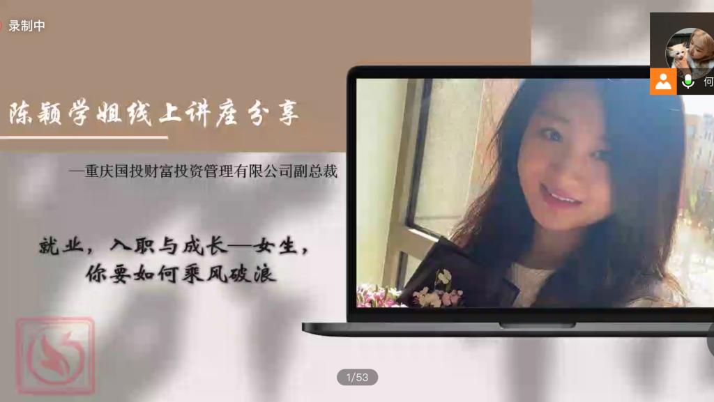 优秀校友陈颖(重庆国投财富投资管理有限公司副总裁)分享了关于女生就业,入职和成长的心得体会,围绕自己的人生导师,职场选择,初入职场小白和女性领导力这四个主题进行分享。她认为初入职场的女生要放下幻想,脚踏实地,厘清自我认知、加深对行业的认知、做到对人性的把握,培养起自我逆商。在互动环节中,同学们积极提问,陈颖也给予了详细的解答,同学们都表示通过学姐的分享和解答收获颇多。
