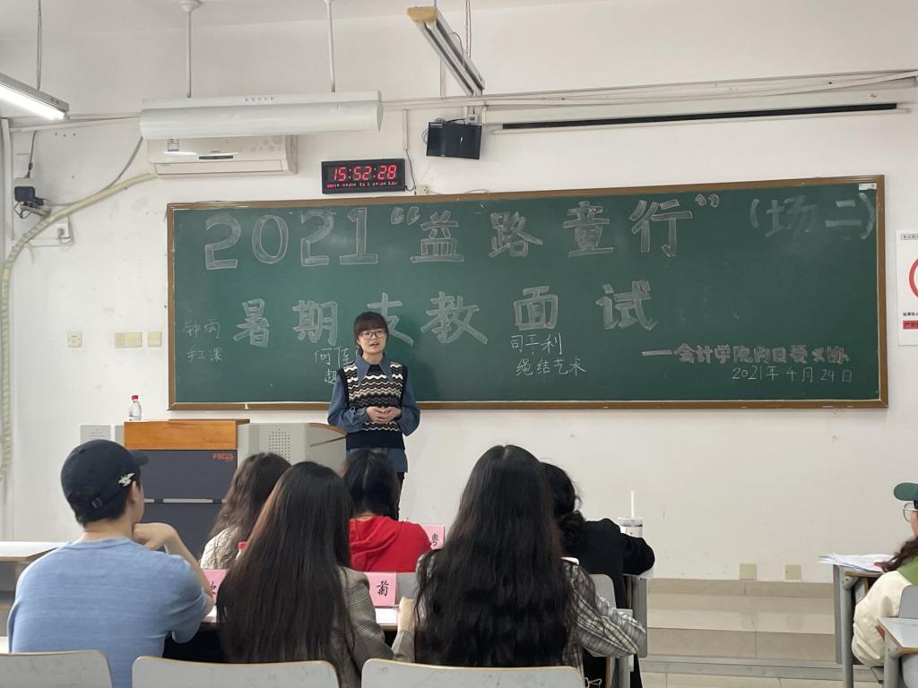 二轮面试于5月14日稳步推进,共计40人参与。主要以志愿者试讲课程形式进行,其对所选教学科目进行模拟课堂讲解,结束后面试人员提出教学建议,帮助其更好地掌握课堂,志愿者吸取建议后亦改进其教学方法,使课堂更加生动有趣。此种面试方式,考察了志愿者综合能力与教学水平,利于选出优秀志愿者。经过两个面试会场共6名面试人员的认真选拔,最终选出30名志愿者加入支教队伍,为暑期支教的顺利实施奠定了坚实的基础。