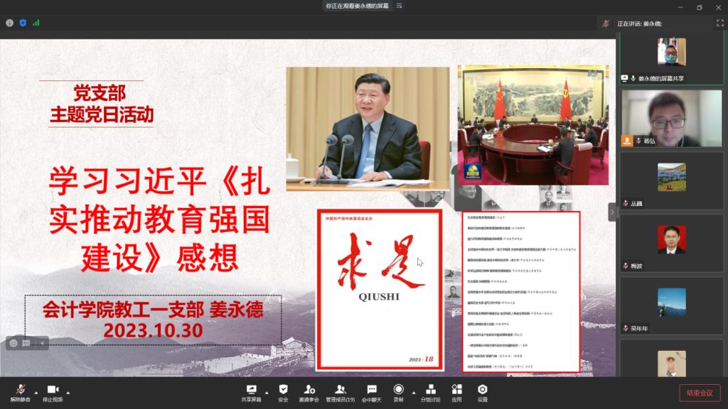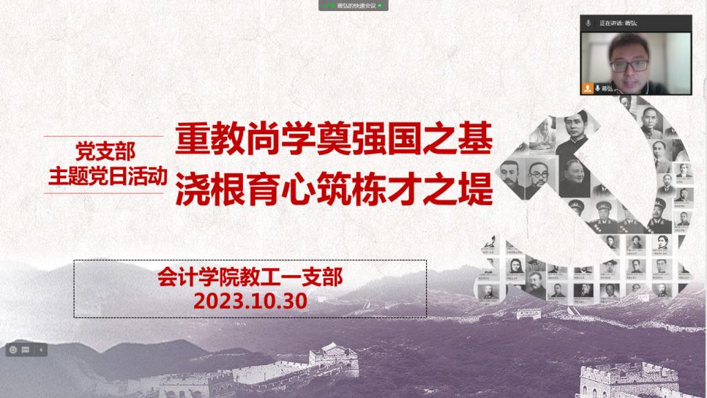 一个民族重视教育、崇尚学习,就能够奠定国家富强、民族昌盛的基础。习近平总书记十分关心我国的教育事业。他提醒我们,浇花要浇根,育人要育心。我们教育的目的是要培养出可以继承中国特色社会主义事业的德才兼备的栋梁之才。这些人才凝聚在一起就会形成一股气势磅礴不可小觑的力量,就像一座坚实庞大的堤坝一样,既能为国家创造价值,也能为国家抵御风险。围绕教育这一话题,必赢国际437教工一支部于2023年10月30日举行了名为“重教尚学奠强国之基,浇根育心筑栋才之堤”的主题党日活动。活动由支部书记蒋弘主持。
